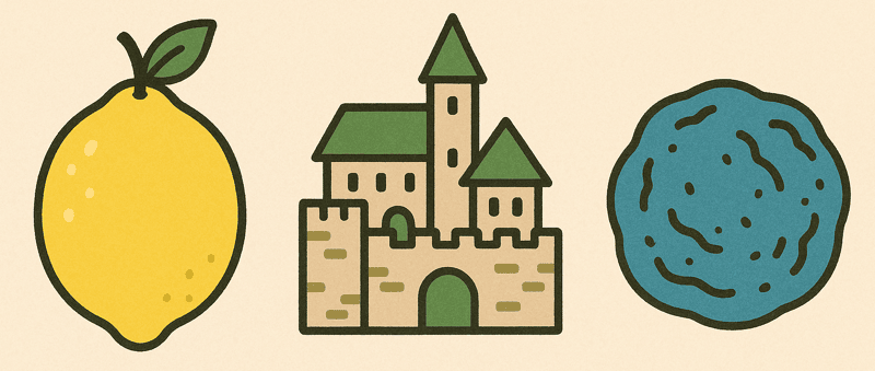 酸っぱい黄色いレモン、中世の街の緑、あるカリカリ梅は青い