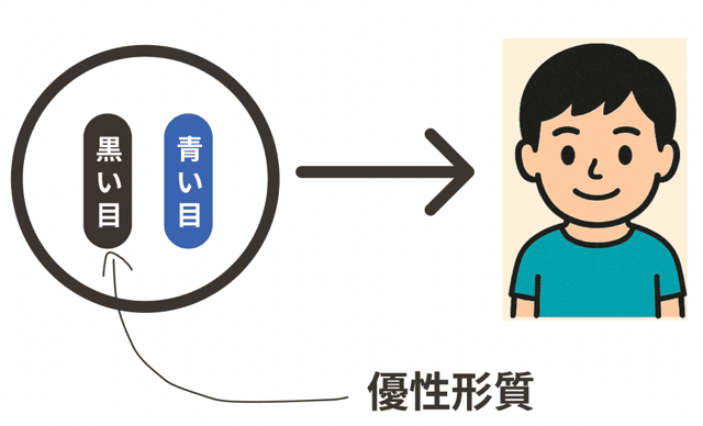子の目が黒かったら、黒い目が優性形質ってことさ。